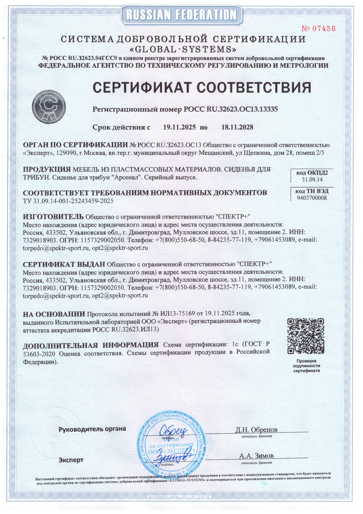 Сертификат соответствия (противопожарный сиденья Арсенал)